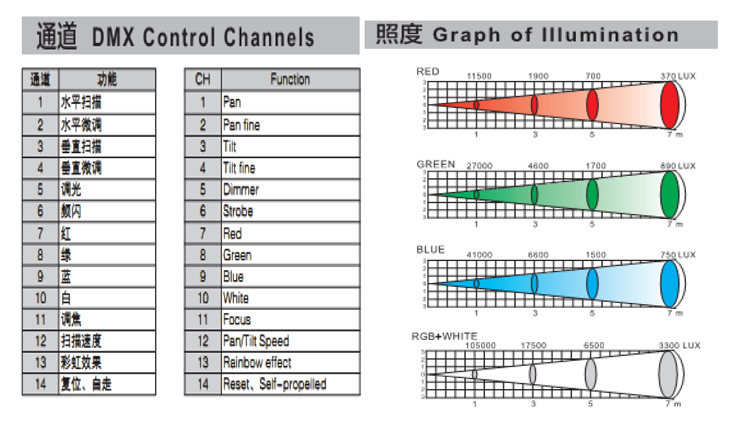 Control: DMX-512, master/slave mode, self-propelled and sound activated